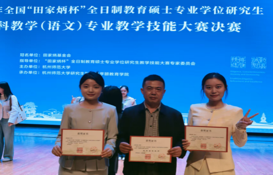 2025年11月7日至9日,2025年全国“田家炳杯”全日制教育硕士专业学位研究生学科教学(语文)专业教学技能大赛决赛在杭州师范大学举行。伟德官网蒋梦薇、帅微琴两位选手发扬拼搏精神,展现了优秀的教学技能,分别荣获二等奖、三等奖。“田家炳杯”教育硕士教学技能竞赛是目前该领域国内层次最高、专业性最强、规模最大、影响最广的全国赛事。本次大赛由全国教育硕士研究生教学技能大赛专家委员会指导,田家炳基金会冠名赞助,杭州师范大学承办。初赛共有来自128所高校575位选手参加,其中173名选手入围决赛。最决赛评选一等奖16名、二等奖32名、三等奖64名。